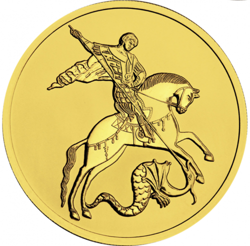 • Аверс золотой монеты «Георгий Победоносец»: в центре — рельефное изображение Государственного герба Российской Федерации. Над гербом вдоль канта расположена надпись полукругом: «РОССИЙСКАЯ ФЕДЕРАЦИЯ», обрамленная с обеих сторон сдвоенными ромбами.