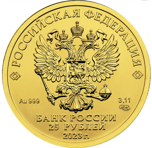 • внизу в центре в три строки — надпись: «БАНК РОССИИ», номинал монеты: «25 РУБЛЕЙ», год выпуска: «2023 г.».
