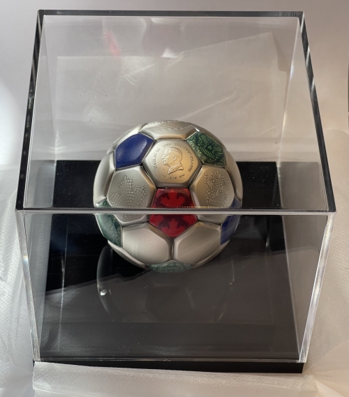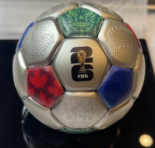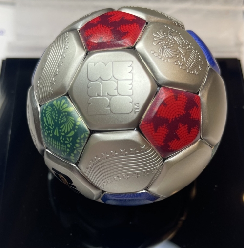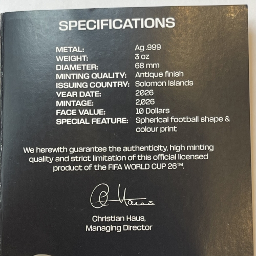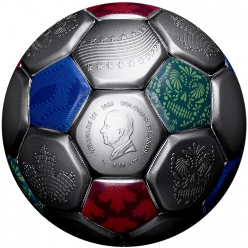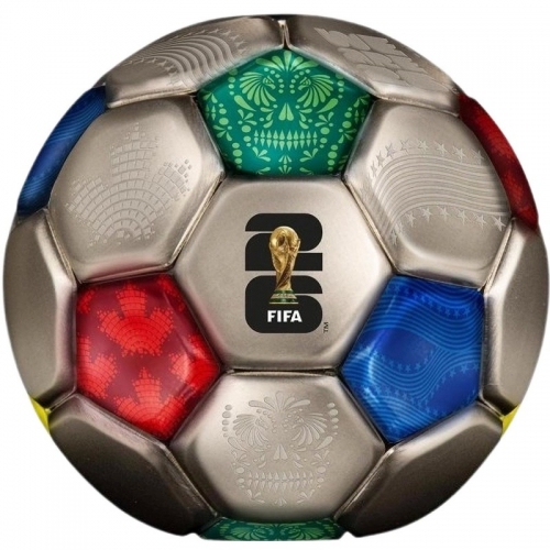 • Эта удивительная серебряная монета весом 3 унции посвящена Чемпионату мира по футболу FIFA™ 2026 года. У нее сферическая форма футбольного мяча с античной отделкой. Поставляется в специальном футляре с сертификатом подлинности. Тираж: 2026 штук.