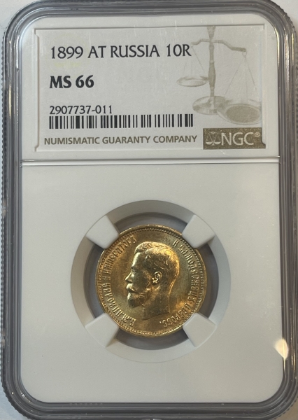 Золотая монета 10 рублей Николай II 1899г.,АГ, в слабе NGC MS 66