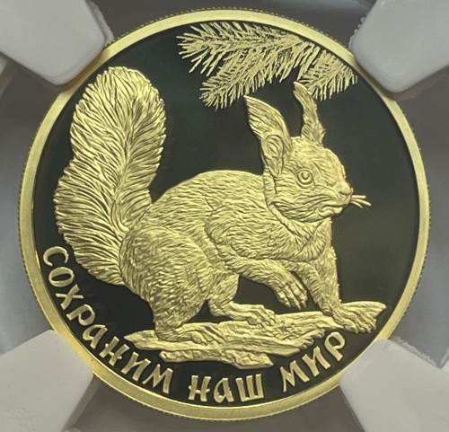 По центру изображена вправо белка на ветке, над ней сосновая ветвь. Снизу вдоль канта надпись «СОХРАНИМ НАШ МИР».