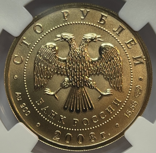 в центре диска - эмблема Банка России (двуглавый орел с опущенными крыльями, под ним надпись полукругом "БАНК РОССИИ"), обрамленная кругом из точек и надписями по кругу: вверху - "СТО РУБЛЕЙ", внизу - "2008 г.", слева - обозначение металла, проба сплава, справа - содержание драгоценного металла в чистоте и товарный знак монетного двора.