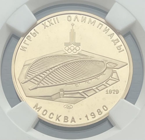 Золотая монета 100 рублей "Велотрек" 1979г. ЛМД В СЛАБЕ NGC PROOF 69 ULTRA CAMEO