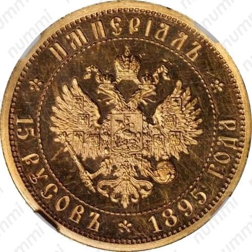 Золотая монета 15 русов Николай II 1895 г., Империал, Пробная, 12,9 г., Au 900