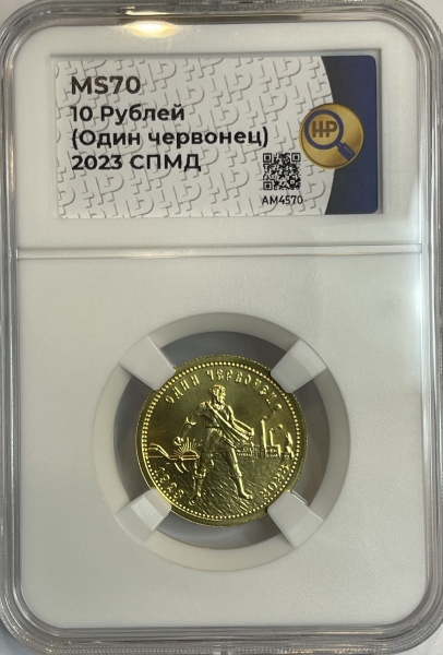 Однако для оборота выпускали не только бумажные деньги. С 1923 года на Петроградском монетном дворе начали выпускать золотые монеты-червонцы, которые по своим параметрам повторяли царские 10 рублей. Их дизайн был разработан медальером Антоном Васютинским на основе эскиза для одной из дореволюционных сельскохозяйственных выставок. На монете в полный рост изображен крестьянин-сеятель на фоне дымящихся труб, плуга и восходящего солнца. Золотых червонцев, датированных 1923 годом, было выпущено чуть более 2,7 млн штук.