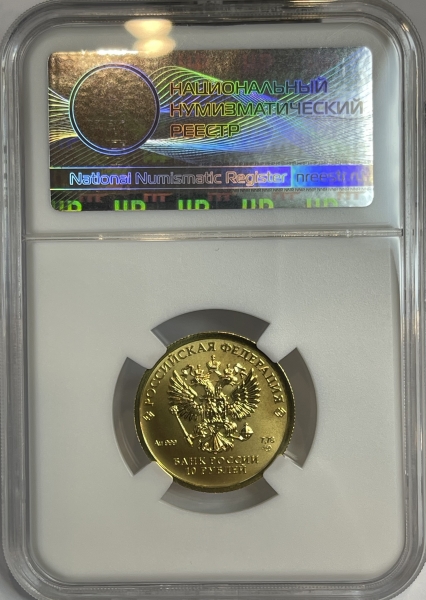 в центре – рельефное изображение Государственного герба Российской Федерации, над ним вдоль канта – надпись полукругом: «РОССИЙСКАЯ ФЕДЕРАЦИЯ», обрамленная с обеих сторон сдвоенными ромбами, внизу под гербом: слева – обозначения драгоценного металла и пробы, справа – содержание химически чистого металла и товарный знак монетного двора, внизу в центре в две строки – надпись: «БАНК РОССИИ», номинал монеты: «10 РУБЛЕЙ».