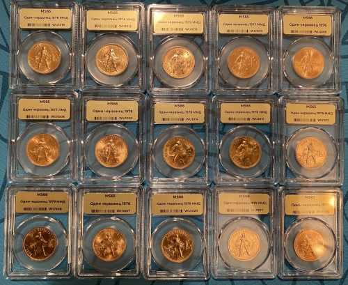 Золотая монета "Червонец Сеятель" 1975-1982 года в слабе MS 65 - MS 66