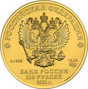 в центре — рельефное изображение Государственного герба Российской Федерации, над ним вдоль канта — надпись полукругом: «РОССИЙСКАЯ ФЕДЕРАЦИЯ», обрамленная с обеих сторон сдвоенными ромбами, внизу под гербом: слева — обозначения драгоценного металла и пробы, справа — содержание химически чистого металла и товарный знак монетного двора, внизу в центре в три строки — надпись: «БАНК РОССИИ», номинал монеты: «100 РУБЛЕЙ», год выпуска: «0000 г.».