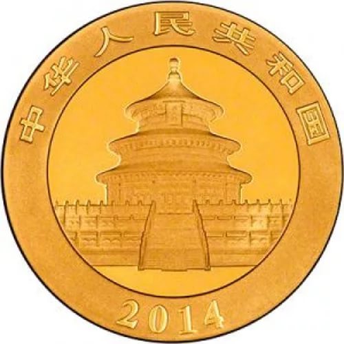 • На аверсе монеты Китайская Панда изображение Храма Неба. Сверху надпись, которая переводится как Китайская Народная Республика, внизу год выпуска (2014).