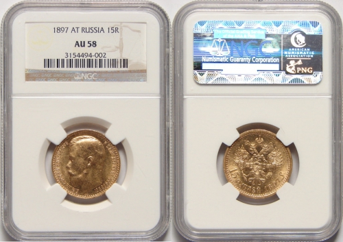 Золотые монеты 15 рублей чеканились с 1897 по 1899 год в соответствии с указом «О чеканке и выпуске в обращение золотых монет» от 3 января 1897 года, подготовленным министром финансов С. Ю. Витте. Независимо от года выпуска, на всех таких монетах обозначен 1897 год. Эти монеты имели хождение в Российской Империи наравне с бумажными деньгами, но в начале XX века постепенно стали изыматься из обращения, и до наших дней сохранилось не так уж много монет в идеальном состоянии.