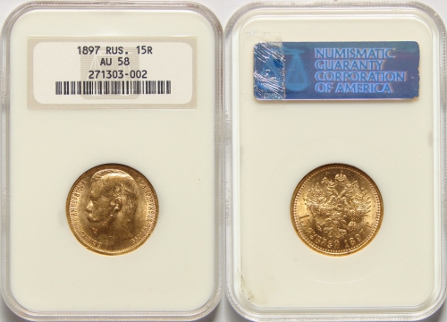 Золотая монета Николая II 15 рублей 1897 год Состояние AU 58