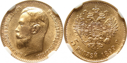 • 5 рублей 1899 года или Полуимпериал чеканился на монетном дворе в Санкт-Петербурге (Россия). Тираж монеты составлял 20.400.004 штук. Качество чеканки UNC.