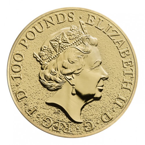 • На аверсе золотой инвестиционной монеты "Лев Англии" - портрет Ее Величества Королевы Елизаветы II, выполненный Джоди Кларком, представленный на британских монетах с 2015 года (так называемый пятый тип монетного портрета королевы). По краю монеты расположены надписи, указывающие номинал монеты и имя Королевы: 100 POUNDS / ELIZABETH II / D / G / REG / F / D.