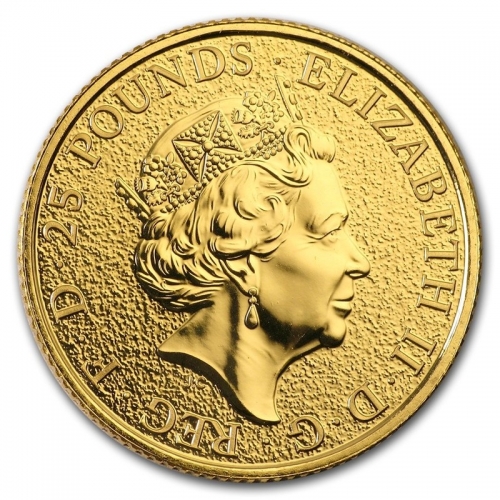 • На аверсе золотой инвестиционной монеты "Красный Дракон" - портрет Ее Величества Королевы Елизаветы II, выполненный Джоди Кларком, представленный на британских монетах с 2015 года (так называемый пятый тип монетного портрета королевы). По краю монеты расположены надписи, указывающие номинал монеты и имя Королевы: 25 POUNDS / ELIZABETH II